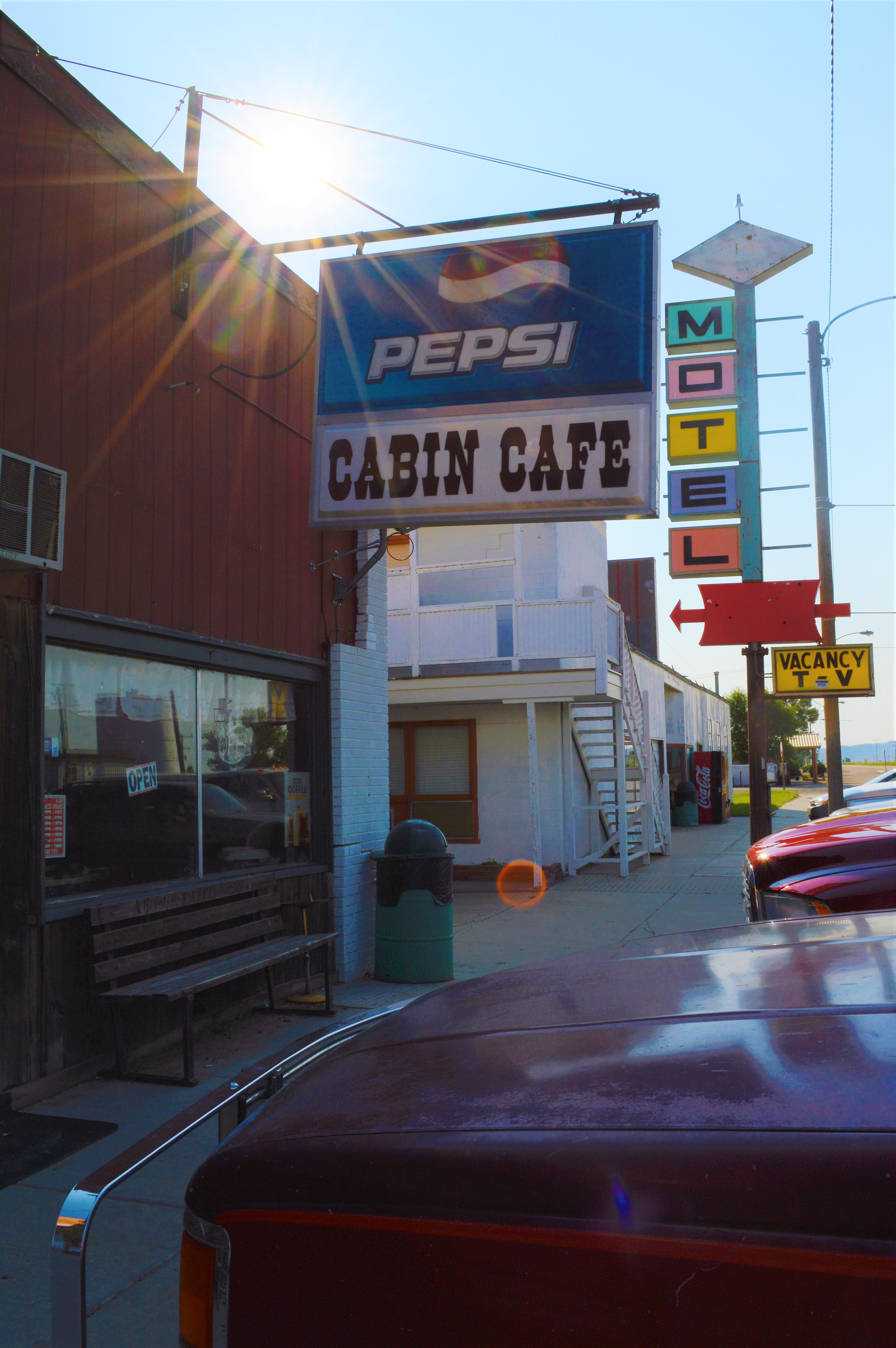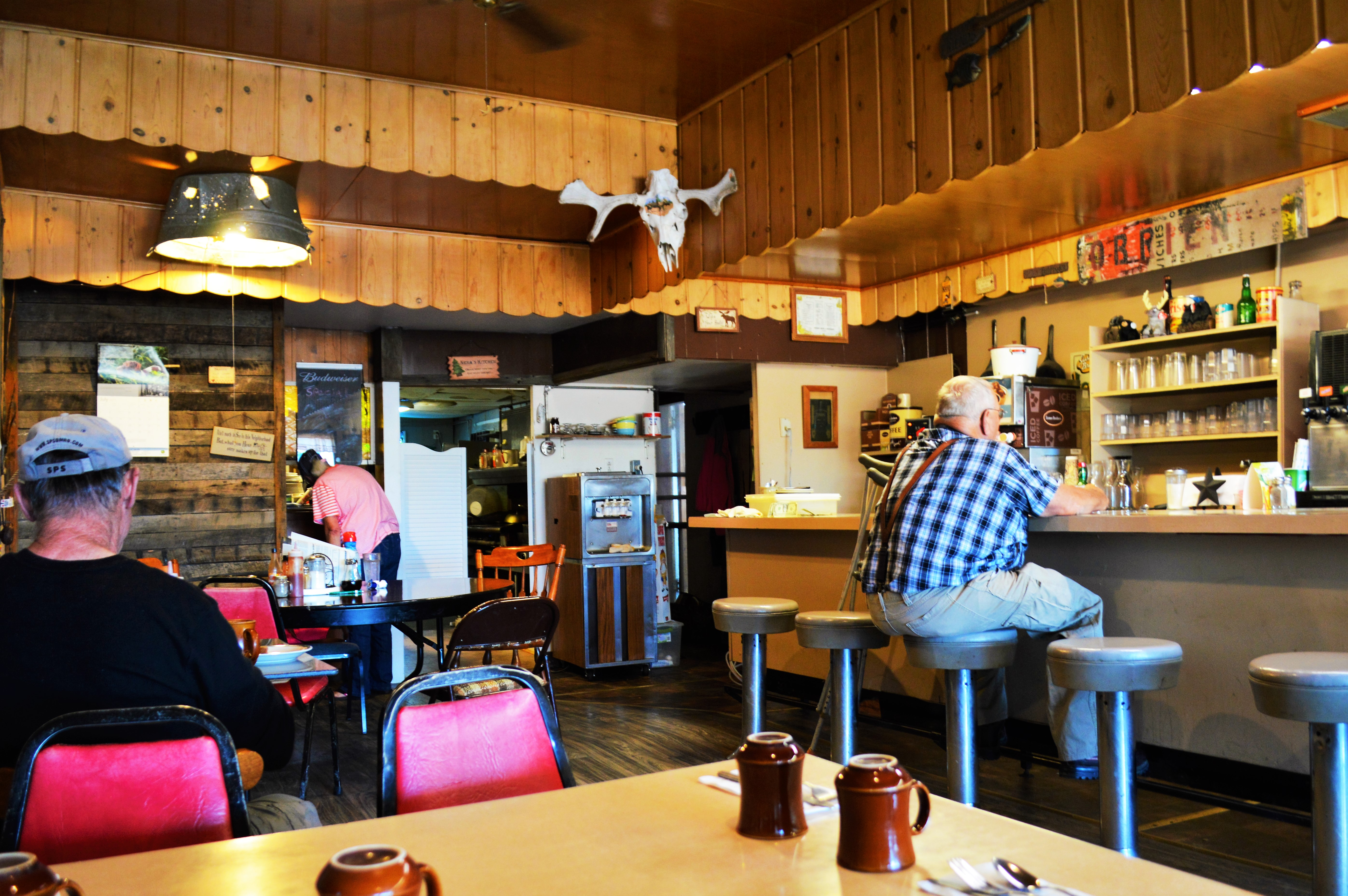 Having eluded the deer, and found our hotel, we continue on the next morning, refreshed. Unable to find a diner in downtown Janesville, we settle for a chain restaurant out by the highway, the kind of place where the portions are huge, but it seems they occasionally run soup through the coffee maker.